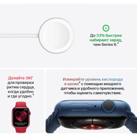 Благодаря тому, что сенсорный датчик встроен в OLED-панель и нижняя часть экрана стала плоской, дисплей получился более тонким. Из-за этого края стали более округлыми, что несвойственно новинкам от Apple. Скругленные края дисплея защитят устройство от повреждений. Они также обеспечивают удобство пользования, поскольку очень плавно входят в корпус. Часы доступны в двух размерах: 41 и 45 мм. Дополнительные ремешки для Apple Watch 7 подходят от предыдущих моделей.